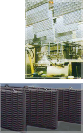 • Paneles absorbentes acústicos, dotados de ganchos para colgar, se suspenden en altura de acuerdo al proyecto acústico más conveniente.