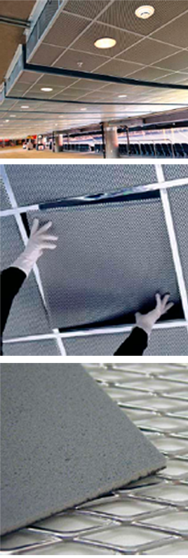 Son placas para cielorrasos suspendidos acústicos de diseño futurista realizado con metal desplegado y material fono absorbente con tratamiento ignífugo.